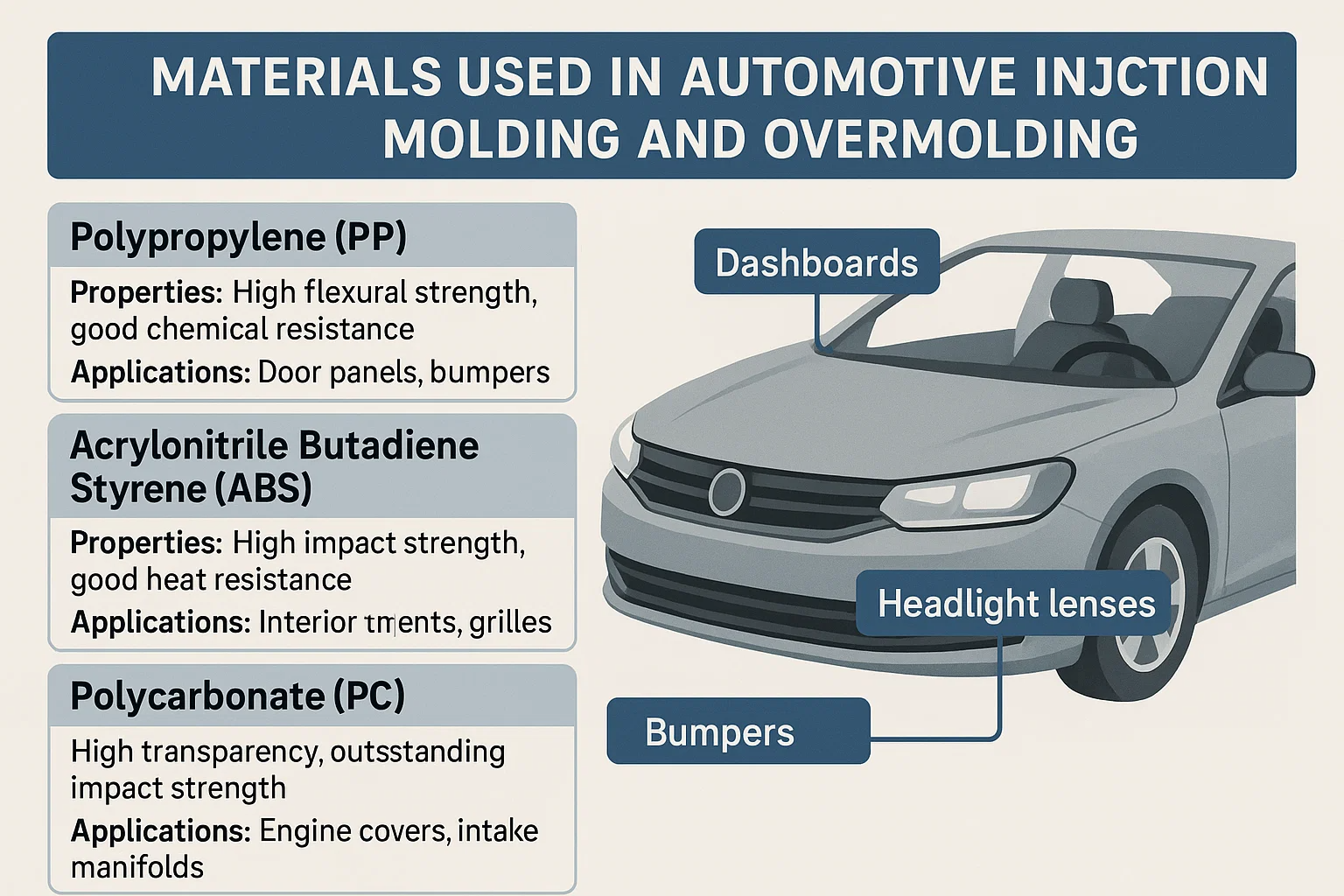 Koszt: Koszt surowca jest zawsze czynnikiem w produkcji motoryzacyjnej o dużej objętości. PP i ABS są ogólnie bardziej opłacalne niż PC lub gatunki specjalistyczne nylonu.