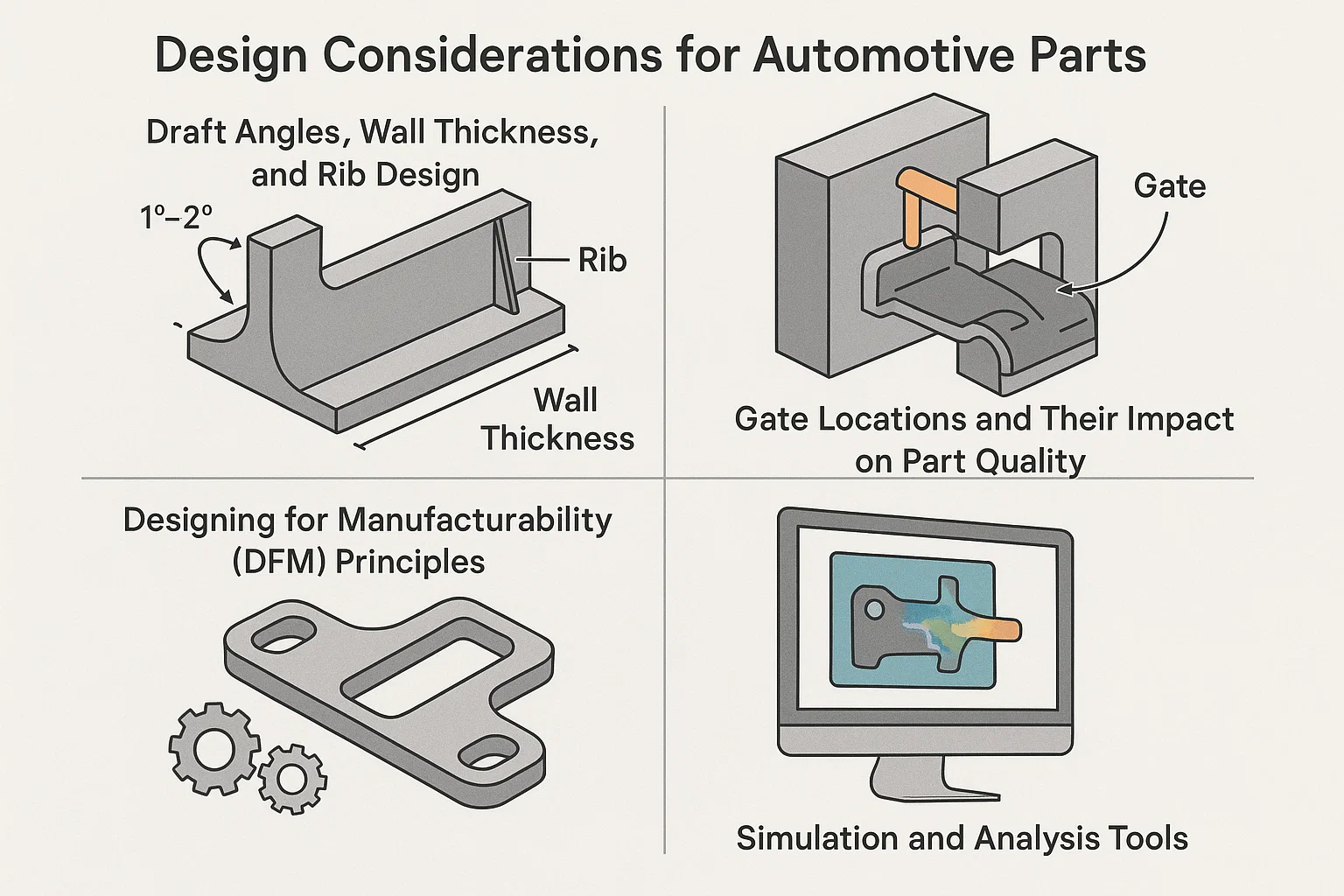 Sukces wtrysku uformowanych i przesadzonych części samochodowych zależy od drobiazgowego procesu projektowania. Dobrze zaprojektowana część jest nie tylko funkcjonalna, ale także produkowana, trwała i opłacalna. Zasady podstawowych zasad projektowania ma kluczowe znaczenie dla uniknięcia typowych problemów, takich jak wypaczanie, słabe więzi i wady kosmetyczne.