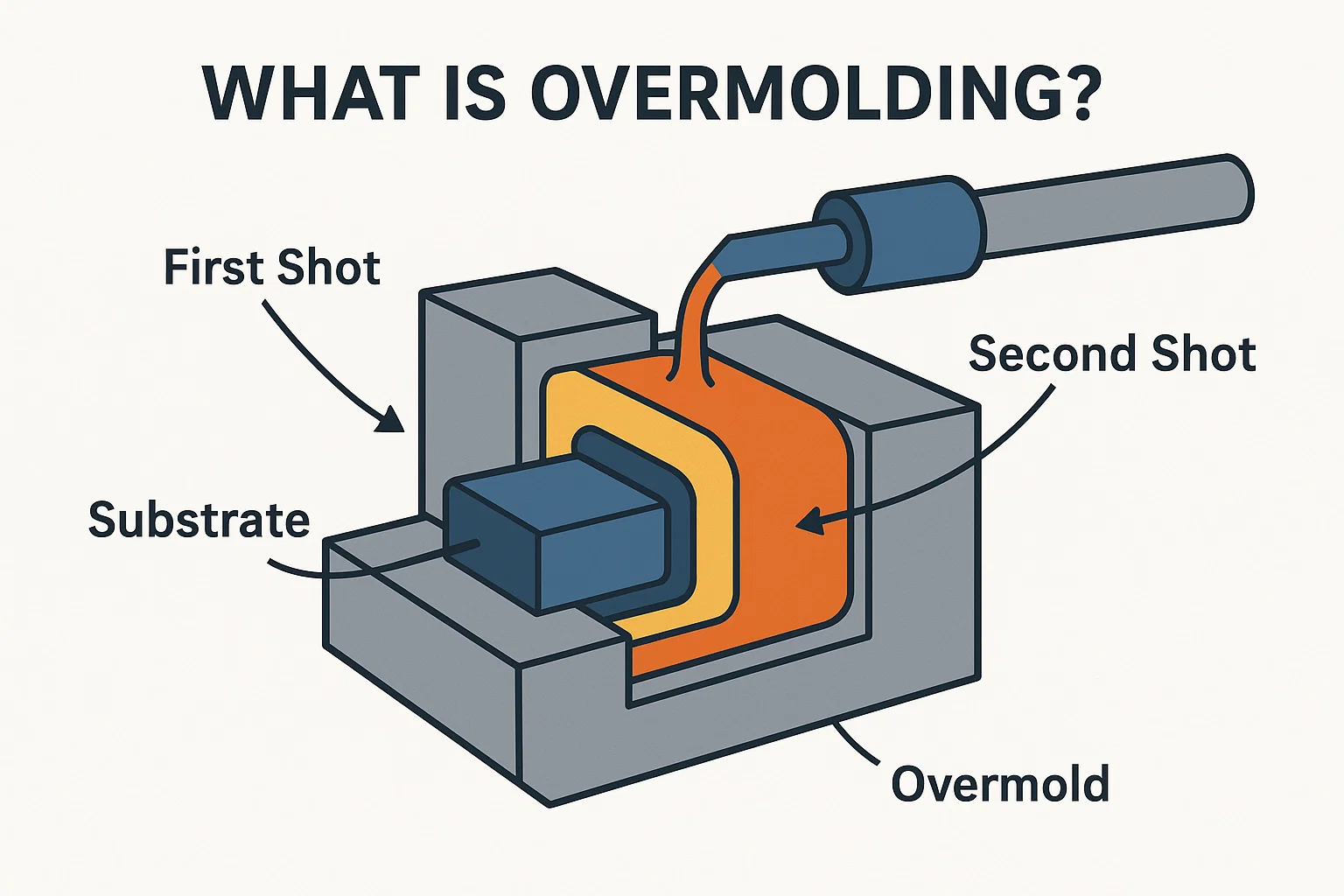 Overmolding jest sekwencyjnym dwuetapowym procesem, w którym drugi materiał jest formowany na stałej, wcześniej istniejącej części. Jest to idealne do dodania miękkiej warstwy do sztywnej podstawy.