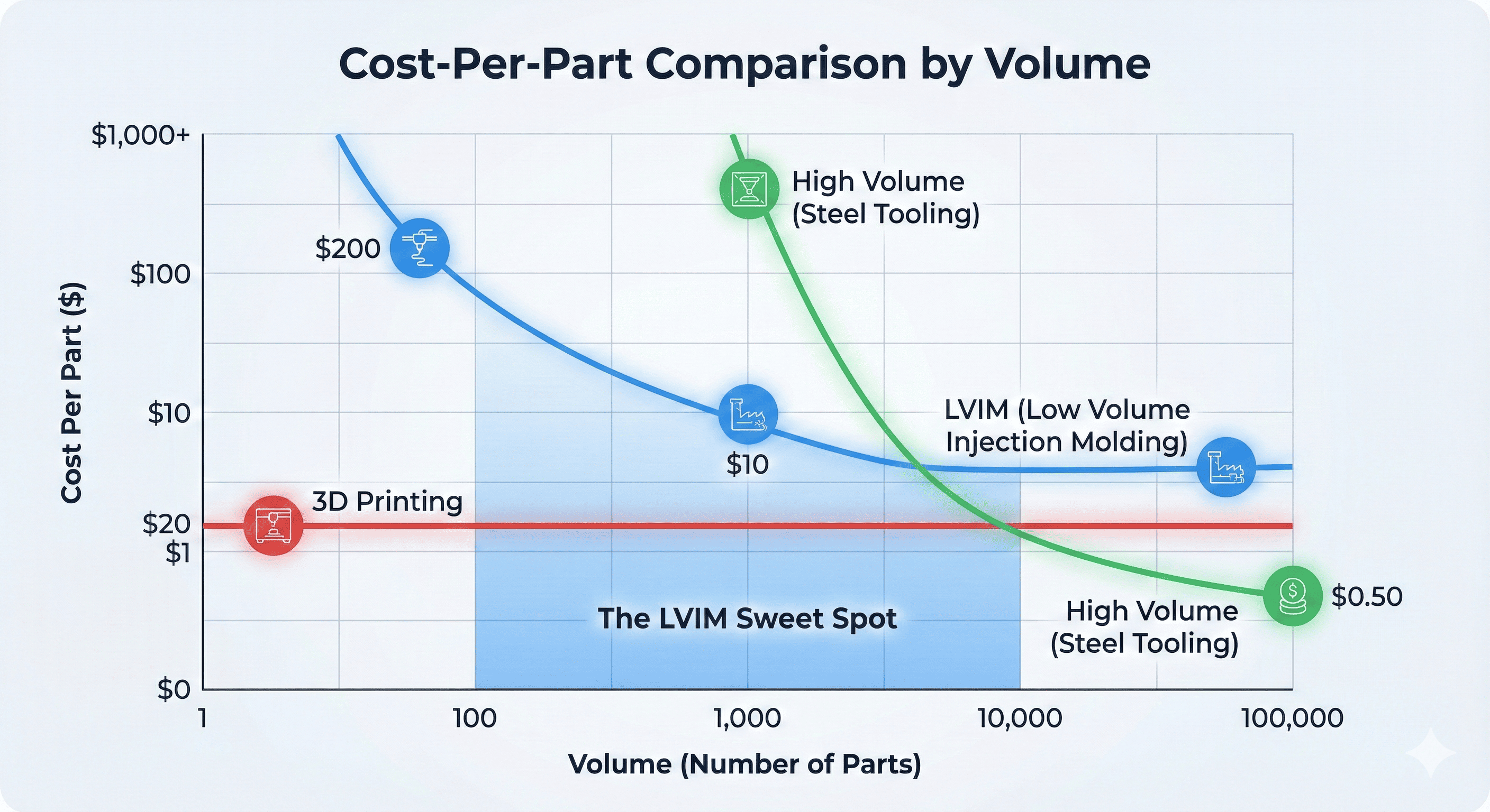 Pomyśl o tym w ten sposób: drukowanie 3D jest jak podróż taksówką. Jest wygodny na krótką wycieczkę, ale nie użyłbyś go do jazdy po całym kraju. Formowanie wtryskowe o małej objętości przypomina leasing samochodu. Na początku jest trochę formalności i zaliczki (koszt formy), ale później każdy kilometr lub każda część jest znacznie tańsza.