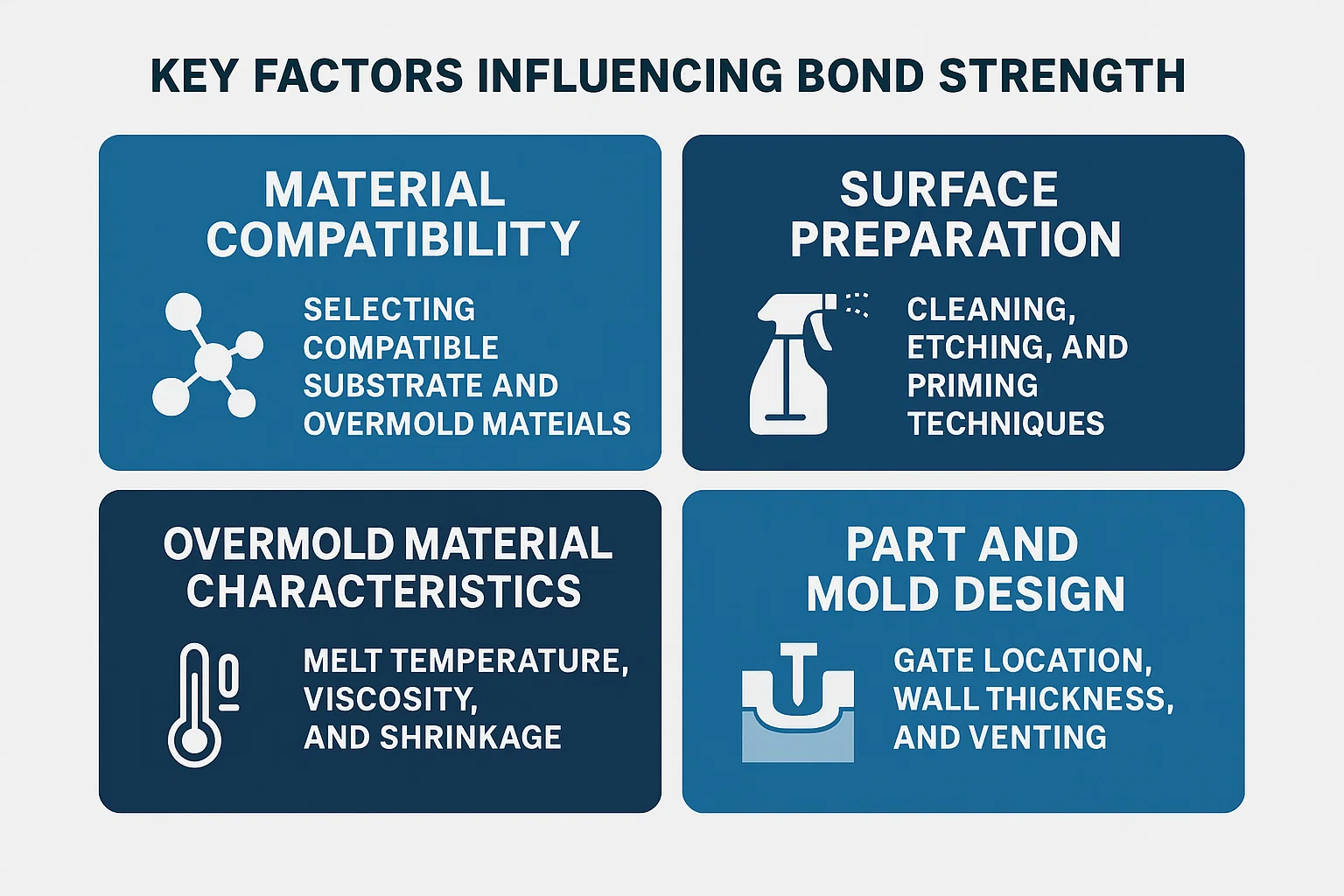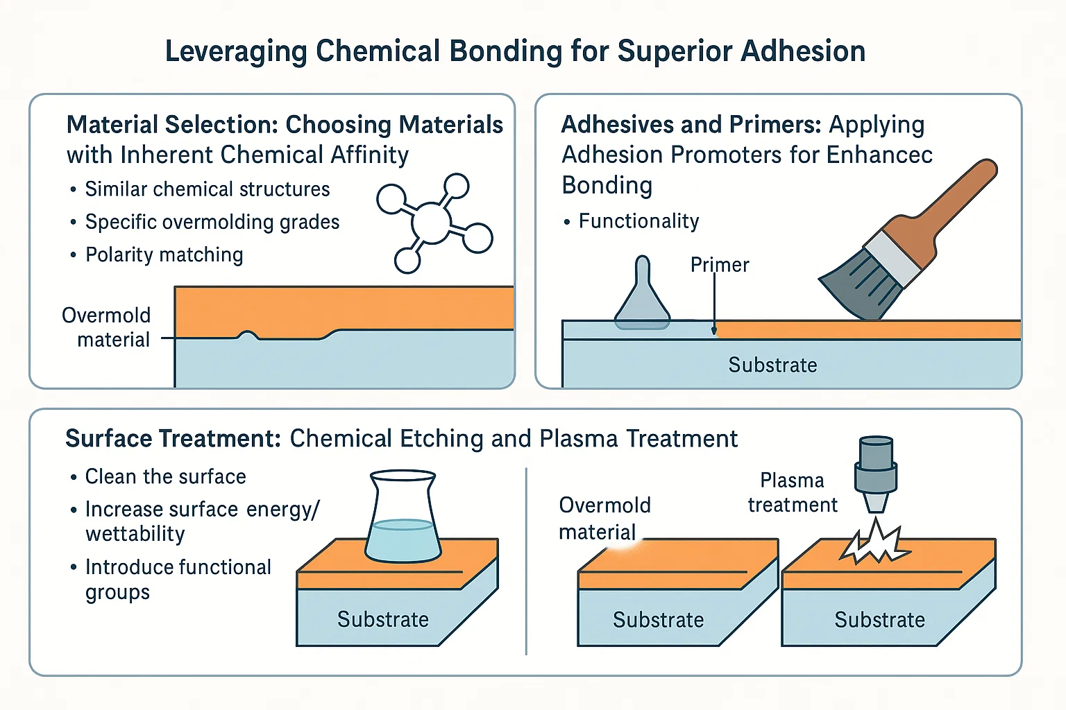 Promotory chemiczne/adhezji: Dla trudnych kombinacji materiałów, podkłady lub promotory adhezji można zastosować na powierzchnię podłoża. Te chemikalia działają jak most, tworząc wiązanie zarówno z podłożem, jak i materiałem overmold. Jest to powszechne w przeważaniu gumowym lub plastikowym.
