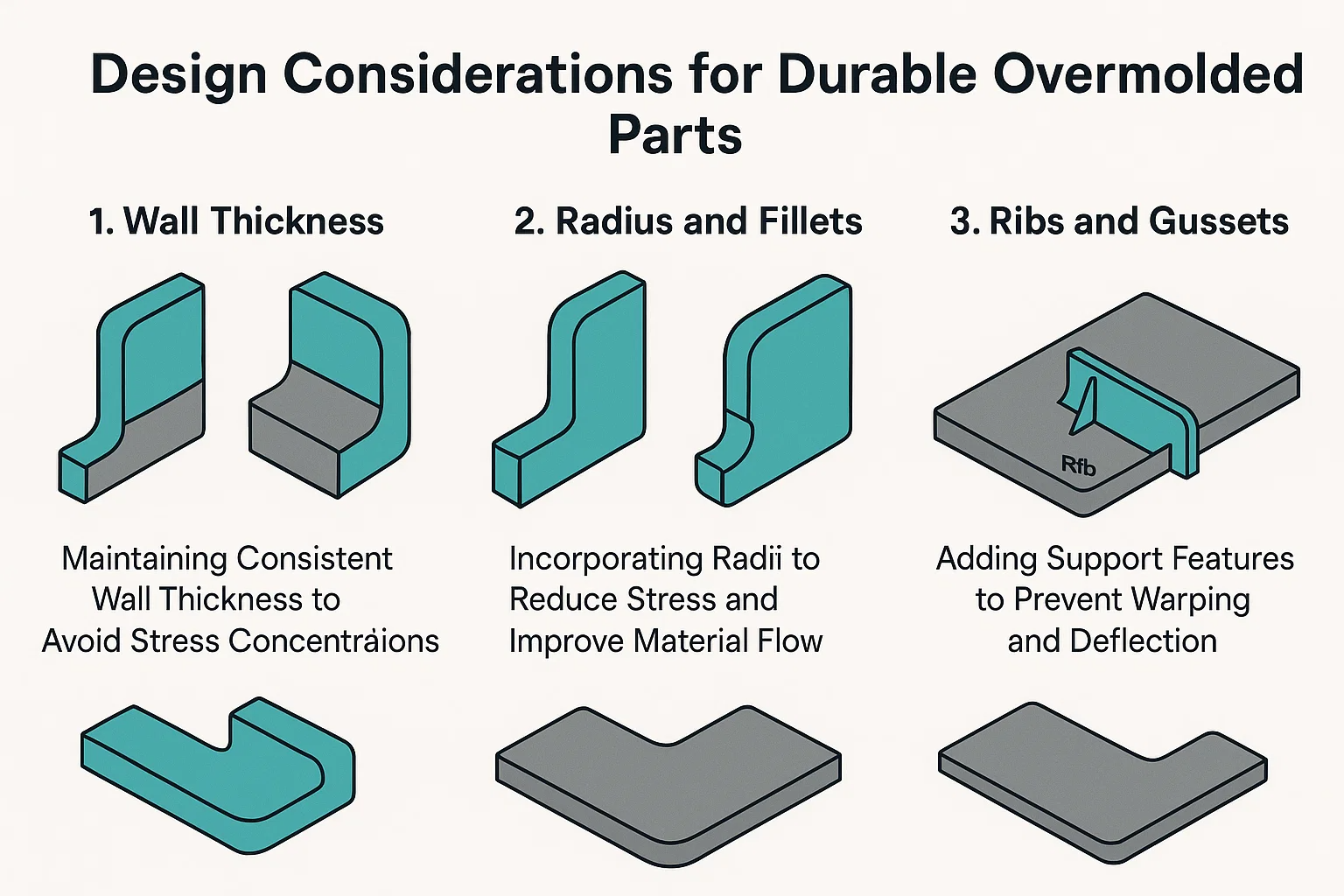 Grubość ściany: Utrzymywanie Konsekwentna grubość ściany W materiale Overmold pomaga zapewnić jednolite chłodzenie i skurcz, minimalizując naprężenie wewnętrzne. Nagłe zmiany grubości ściany mogą prowadzić do zróżnicowania chłodzenia, wypaczenia i osłabionych wiązań.