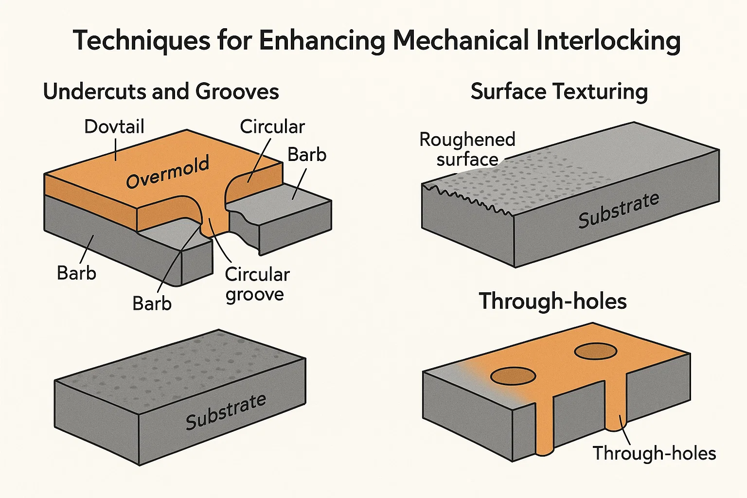 Pomyśl o podcięciach i rowkach jako mikroskopijnych haczykach lub kotwicach w podłożu. Kiedy stopiony materiał overmold wpada do tych funkcji i ochładza, zestala się wokół nich, tworząc zamek fizyczny.