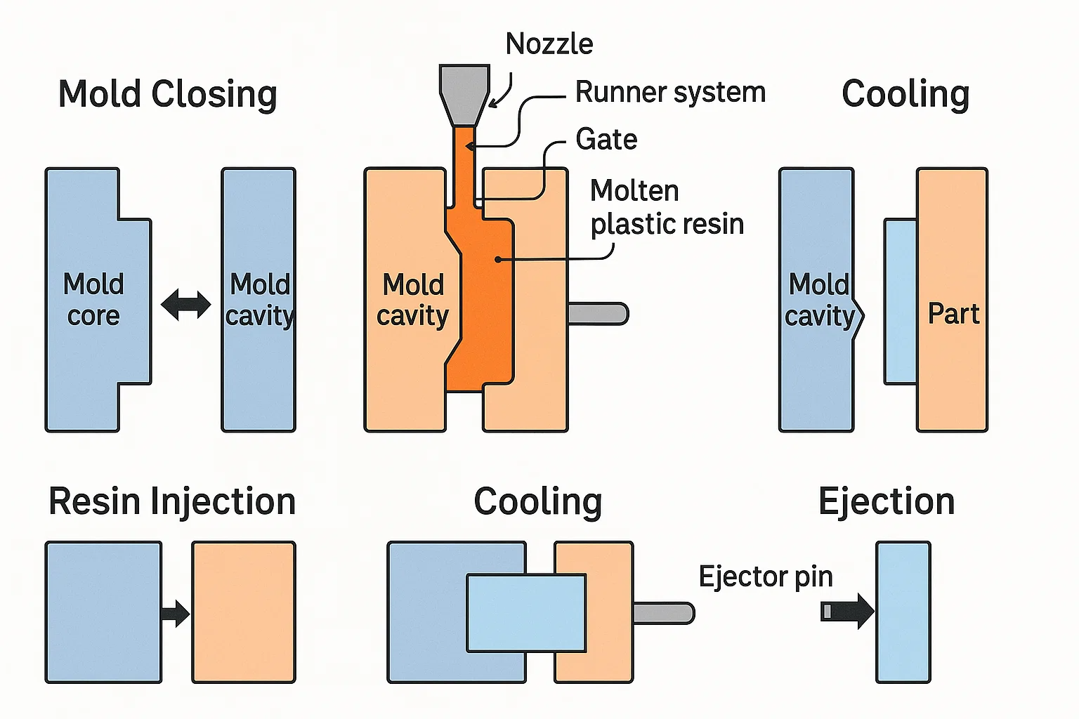 Wstrzyknięcie żywicy: Stoptowana plastikowa żywica jest wstrzykiwana pod wysokim ciśnieniem przez dyszę i do formy. Materiał podróżuje przez system biegaczy and brama - Które są częścią połowy wnęki - i wypełnia przestrzeń między rdzeniem a wnęką. Rdzeń wypiera żywicę, tworząc wewnętrzny kształt części, podczas gdy wnęka tworzy zewnętrzną skorupę.