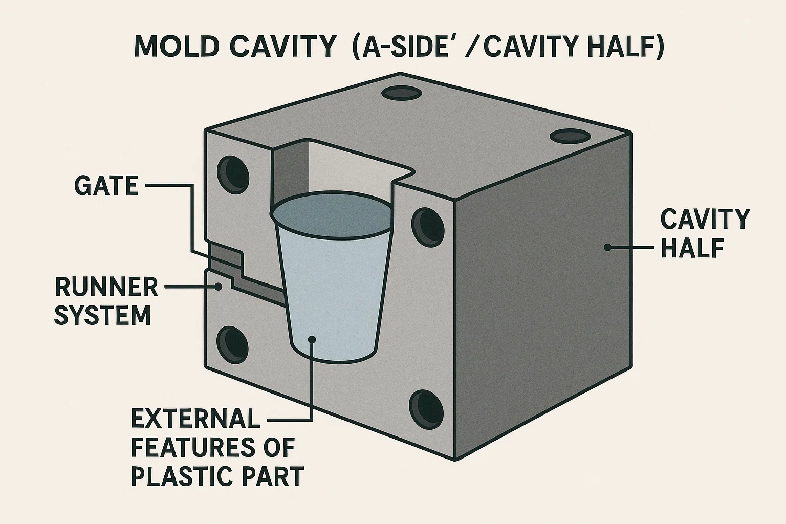 . wnęka pleśni , znany również jako „strona A” lub „połowa wnęki”, jest składnikiem, który tworzy funkcje zewnętrzne części plastikowej. Jest to zewnętrzna skorupa lub pojemnik, który wypełnia stopiony plastik. Korzystając z analogii plastikowej kubka, wnęka utworzyłaby zewnętrzną kubek, w tym warga i ściany zewnętrzne.