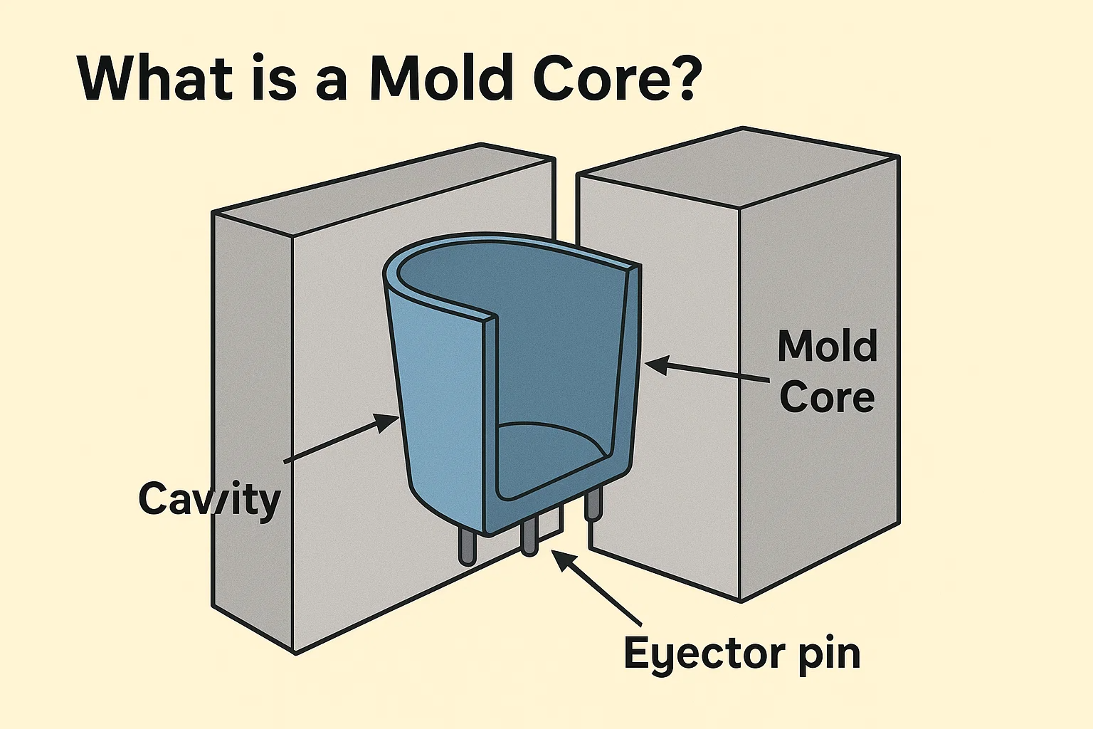 . rdzeń pleśni , znany również jako „po stronie B” lub „rdzeń” formy, jest składnikiem, który tworzy Funkcje wewnętrzne części plastikowej. Po zamknięciu pleśni rdzeń pasuje do wnęki, tworząc przestrzeń, do której wstrzyknięto stopiony plastik. Pomyśl o tym jak o ciosu, który tworzy puste lub zagłębione obszary w części.