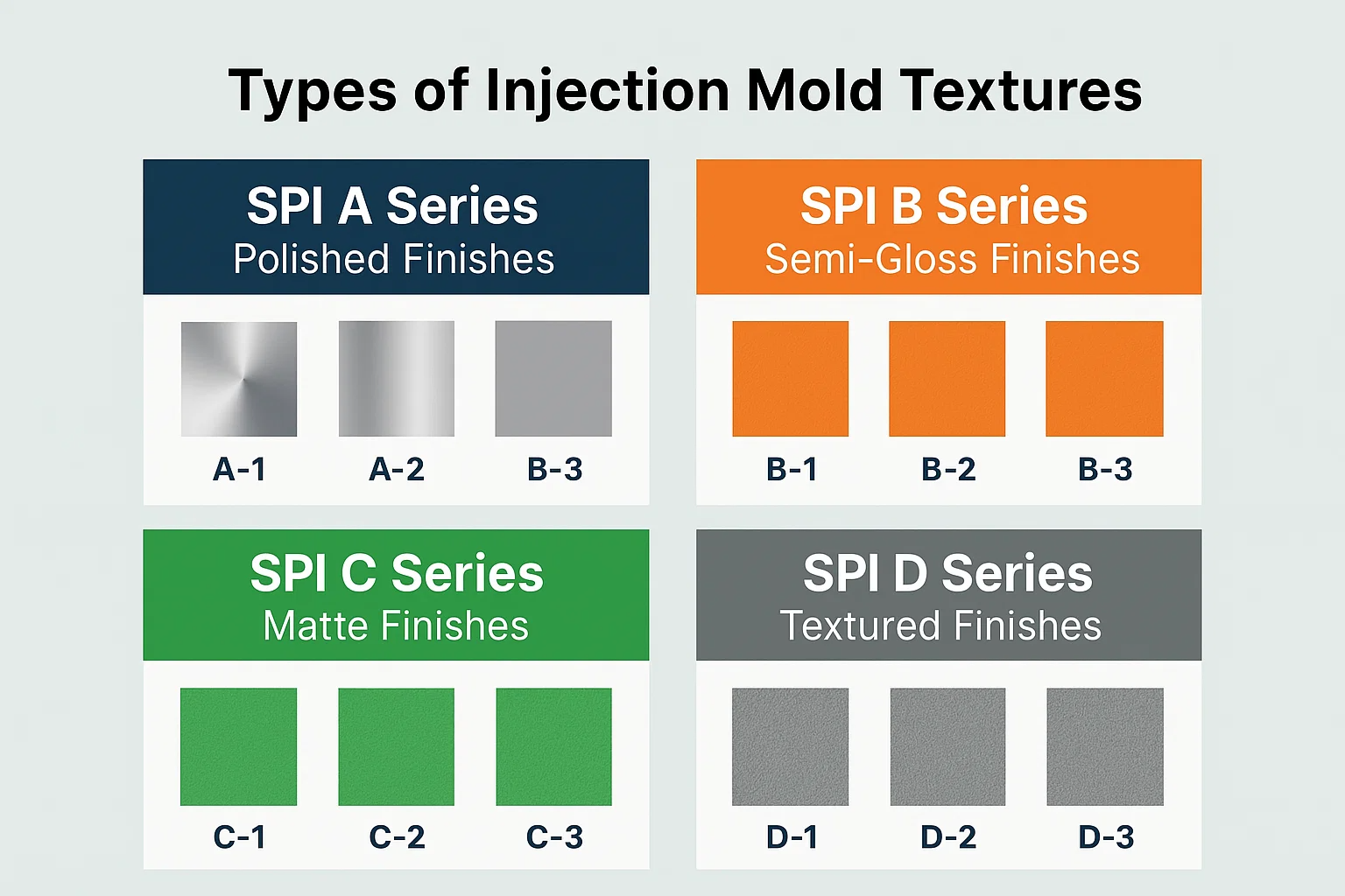 System SPI kategoryzuje wykończenia na podstawie metody zastosowanej do ich osiągnięcia i wynikającego z nich wygląd, od wysoce wypolerowanej, lustrzanej powierzchni po matową, matową teksturę. Standardy są podzielone na cztery główne grupy (A, B, C i D), każda z trzema podgrupami.